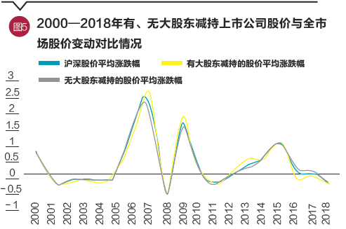 从对股价的影响来看,2000—2018年19年期间,共有12年上市公司平均股价上涨,7年上市公司平均股价下跌。在上市公司平均股价上涨的12年中,有大股东减持的上市公司平均股价涨幅大于无大股东减持的上市公司平均股价涨幅的有7年,小于无大股东减持的上市公司平均股价涨幅的有5年;在上市公司平均股价下跌的7年中,有大股东减持的上市公司平均股价跌幅大于无大股东减持的上市公司平均股价跌幅的有5年,小于无大股东减持的上市公司平均股价跌幅的有2年。因此,在市场整体上涨时,大股东减持对公司股价的影响较小;在市场整体下跌时,大股东减持对公司股价的负面影响更为明显(见图5)。