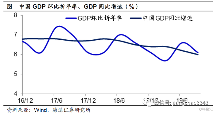 但是从19年开始,由于去杠杆转入稳杠杆,社融增速出现了企稳回升,而且是连续两个季度回升。如果社融对经济的领先性依旧成立,那么意味着19年4季度开始的两个季度中经济有望短期企稳改善。而从19年3季度开始社融增速再度小幅下滑,传导到经济的下滑应该是在2020年2季度以后。