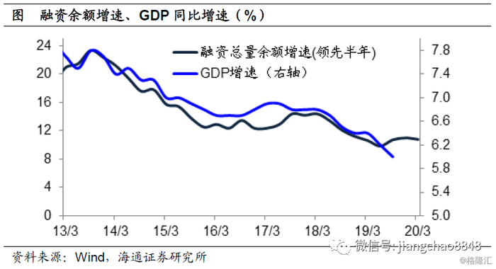 一个重要的原因在于,由于从居民企业融资到消费和投资行为之间存在时滞,因而货币融资增速往往领先于经济变化。从中国过去的数据来观察,社融增速领先于经济变化两到三个季度左右。