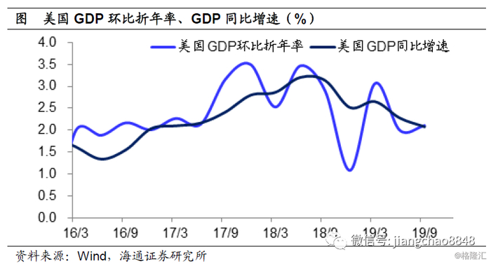 1)美国三季度GDP上修至2.1%。上周三,美国商务部公布三季度实际GDP环比折年率上修至2.1%,高于初值1.9%,且略高于二季度的增速2.0%。分项数据中,消费维持稳定,但商业投资仍弱。