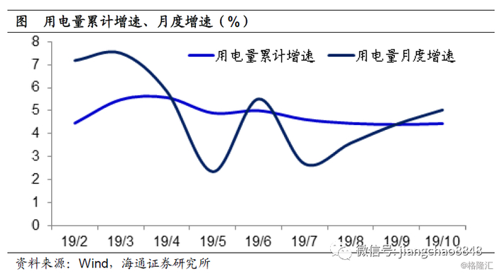 今年9、10两月的用电量增速分别是4.4%和5%,而今年以来的用电平均增速为4.4%,这意味着近两月的用电情况要持平甚至略好于全年均值。事实上,从用电增速来看,今年最差的是5、7两个月。