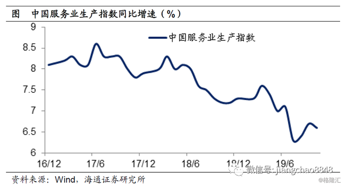 为什么大家不用服务业的数据呢?因为过去中国的服务业只有季度数据,而缺乏月度的高频数据指标,所以大家习惯使用工业增速来代表一切。但其实从17年起,统计局已经开始发布月度的服务业生产指数。