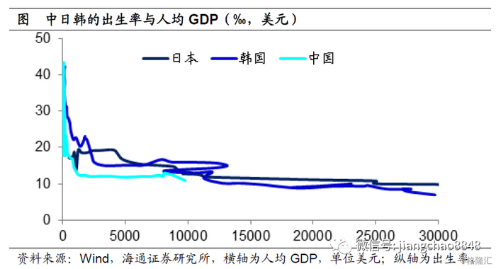 我们发现,导致生育率下降的最主要原因其实是抚养成本的上升。中国的人均GDP已经达到1万美元,即将跨入世行提出的1.2万美元的全球高收入国家行列。而当年日本、韩国在人均GDP达到1万美元之后,其出生率也大幅下降至10‰左右,跟我们现在差不多。