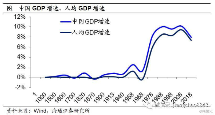 从中国经济发展的历史来看,从公元1年到1600年的增长几乎长期停滞,从1600年以后开始出现0.5%左右的增长,但几乎全部来自于人口的增长。只有在新中国成立之后,GDP增速才达到2%以上的全球平均增速。而在改革开放之后,GDP增速超过了8%。