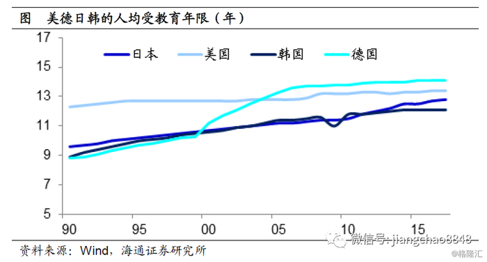 但在跨入1万美元的门槛之后,日本和韩国又保持了10年的4-5%左右的中速增长,其实靠的并不是人多,而是人口素质的持续提升,体现为其人均受教育水平的提高。因为抚养成本的上升,其实也意味着人口素质的上升。