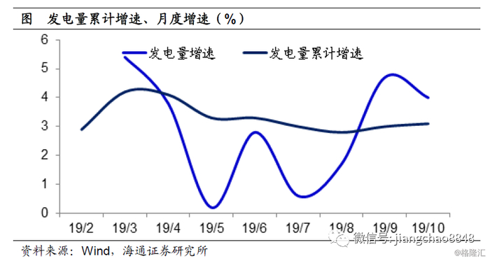 发电量增速反映出今年经济最差的时间同样是在5月和7月,而从9月以来已经连续3个月出现了明显的改善,这与工业增速所显示的经济持续下滑其实完全不同。