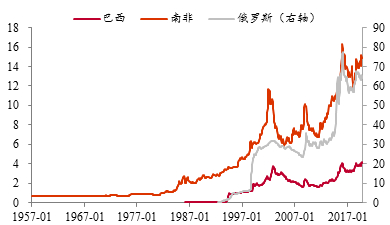 巴西、南非、俄罗斯三国本币对美元的汇率变化