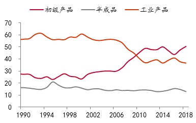 巴西也有类似现象。2004年巴西第二产业的占比为24.3%,到2018年降至18.4%,原本第二产业占比就偏低,如今更低了。从出口结构看,1990年巴西的工业制成品占比达到56.4%,2018年降到了36.6%,初级产品的出口则从27.3%上升至50.4%。也就是说,巴西经济更加依赖于大宗商品出口。