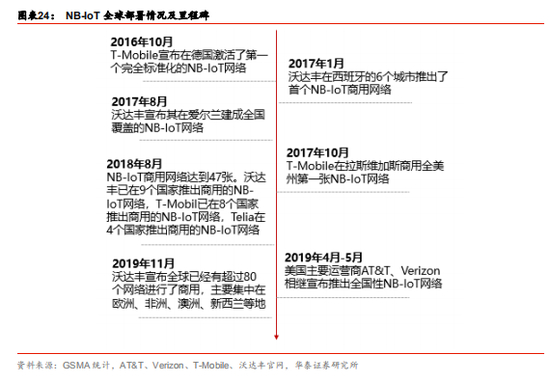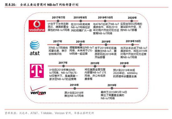 NB-IoT 是目前全球主流运营商支持的标准技术。全球范围内,自 2017 年以来,主流运营 商对 NB-IoT 部署不断加码。其中欧亚市场开始较早,美国主要运营商对 NB-IoT 先持观望 态度,随后于 2018 年,NB-IoT 凭借技术和产业优势在美国成功翻盘,美国市场成为四家 主要运营商(AT&T、Sprint、Verizon、T-Mobile)新的角逐场。NB-IoT 的领军运营商沃 达丰发挥全球管道优势,与华为等合作伙伴共同开发公共事业、医疗、智慧城市等行业。