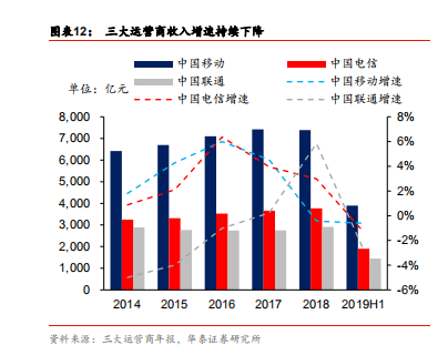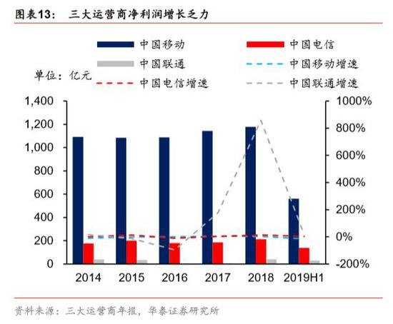 运营商整体营收和净利润增速下降。虽然运营商用户流量逐月大幅增长,但单价下降较快, 导致三大运营商 2019H1 营业收入增速均有所下降,2019 H1 中国移动、中国电信和中国 联通营收分别为-0.61%、-1.32%和-2.78%;从净利润情况看,除中国联通受到混改红利 影响 2018 年净利润大幅提升,中国移动和中国电信净利润增速均有所下降,中国移动 2019H1 首次出现净利润下滑。