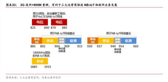 2G 网络的腾退和运营商低频重耕计划上来看,中国移动腾退 15M 频谱资源,获得 40M 频谱资源。中国电信腾退 20M 频谱资源,获得 5M 的 1880~1885MHz 频段资源。中国联 通腾退 20M 频谱资源,获得 10M 低频 900MHz 资源。预计 2G 退网以及 900M 频谱重 耕为三大运营商共同推进 NB-IoT 物联网业务发展,提供了网络部署基础。