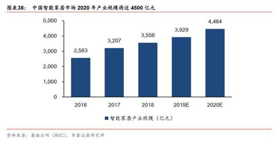 根据 IDC 2019 年智能家居市场数据预测显示,智能家居行业在美国形成亚马逊、谷歌与 苹果三强争霸局面,在国内主要由小米、海尔、美的、阿里和百度五大厂商占据近半数的 市场份额。细分领域来看包括智能家电、智能影音、智能照明、家庭安防、智能连接与控 制等。根据奥维云网(AVC)发布“AIoT 时代下智能家居行业发展及趋势报告”显示, 预计 2020 年中国智能家居产业规模将近 4500 亿元。