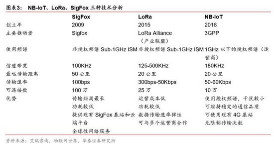 相比此前主流的 LoRa、SigFox 技术,NB-IoT 由运营商强力推出。LoRa WAN 是由各产 业联盟共同推动的网络标准,提供开放式技术;Sigfox 则是由法国同名公司自行开发的技 术,掌握核心网络的建设和营运,在全球范围内进行网络部署。LoRa 与 Sigfox 都具有长 距离、低功耗的特点,可延长电池寿命,形成大范围的讯息传输,且均使用非授权的 Sub-1GHz ISM 频段,不需额外付出授权费用。NB-IoT 则大有不同,使用需授权的 GSM 和 LTE 频段,且 不需重新布建网络,只要更新软件,就能使用现有的 4G 基站和相关设备。
