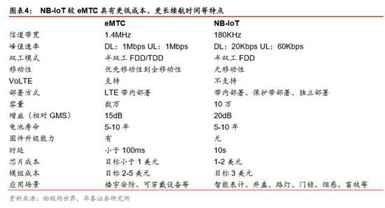 NB-IoT 较 eMTC 具有更低成本、更长续航时间等特点,适合无移动性应用场景。eMTC 也是基于 LTE 演进的物联网接入技术,与 NB-IoT 一样使用的是授权频谱,但 eMTC 支持 高速移动可靠性和拥塞控制,较 NB-IoT 而言,eMTC 在时延和吞吐量有较大优势。NB-IoT 追求更低的成本、更长的续航时间,比较适合对成本敏感但是终端数量较大,且无移动性 的应用场景,与 eMTC 形成互补。