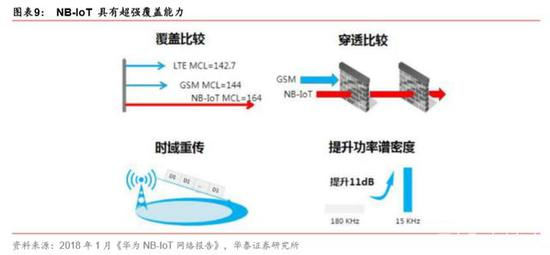 第四大特点:超强覆盖。通过时域重传技术和提升功率谱密度,根据《华为 NB-IoT 网络 报告》内容,相比 GSM 提升了 20dB 的 MCL(传送数据时设备和基站的天线端口之间的 最大总信道损耗,MCL 值越大,链接越强大,信号覆盖范围越广),覆盖距离达到了 GSM 的三倍,穿透能力相当于比 GSM 能多穿透两堵墙。