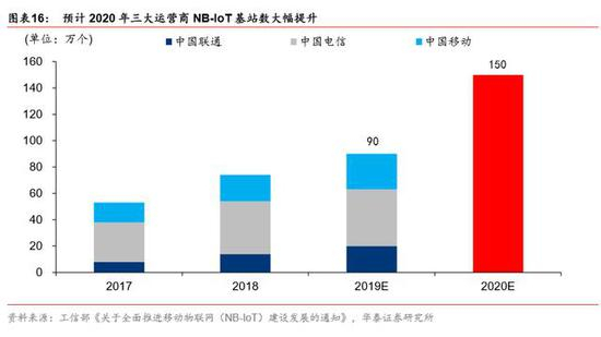 预计 2020 年三大运营商 NB-IoT 基站规模将达 150 万,较 2019 年的 90 万增长明显。根 据中国信通院无线电中心副主任潘峰在 2019年NB-IoT千行百业“亿”启航生态峰会上表示, 2019 国内三大运营商 NB-IoT 基站数已达到 90 万,根据 2017 年 6 月 6 日,工信部办公 厅正式下发《关于全面推进移动物联网(NB-IoT)建设发展的通知》显示,计划 2020 年 我国 NB-IoT 基站规模将达到 150 万个,实现对于全国的普遍覆盖以及深度覆盖。