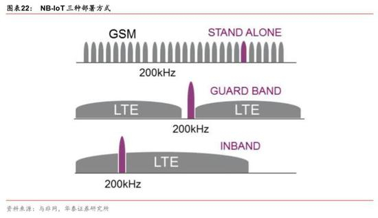 独立部署(Stand alone operation)简称 ST,不依赖于 LTE,与 LTE 可以完全解耦, 适合用于重耕 GSM 频段,GSM 的信道带宽为 200KHz,刚好为 NB-IoT 180KHz 带 宽辟出空间,且两边还有 10KHz 的保护间隔。2. 保护带部署(Guard band operation)简称 GB,可以不占用 LTE 资源,利用 LTE 边 缘保护频带中未使用的 180KHz 带宽的资源块。