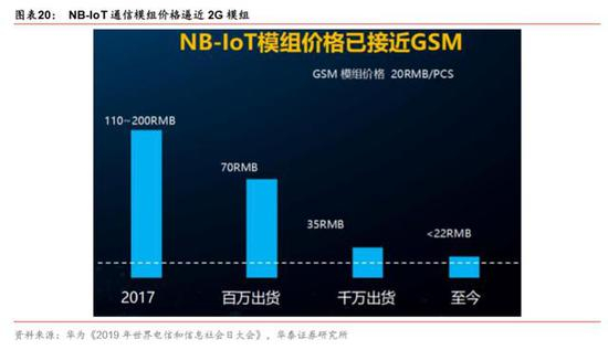 根据 2019 年中国 NB-IoT 产业发展大会上中国 NB-IoT 产业联盟秘书长解运洲表示,预计 2020 年 NB 模组价格进一步降至 3 美金,与 2G 模组持平,更低的使用成本让 NB-IoT 行 业应用进入快速发展期。由于运营商在 NB-IoT 行业发展初期给予大力补贴,使得终端用 户的渗透率加速提升。