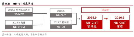 2014年 5月华为、Vodafone提出了NB M2M技术,而后 2015年 5月又进化成 NB-CIoT, 2015 年 7 月,Nokia、Ericsson、Intel 提出了 NB-LTE 技术,随后 3GPP 着手制定标准, 并在 2016 年 7 月确定标准,至此 NB-IoT 正式诞生。