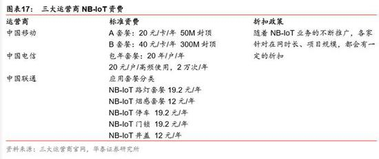 在资费方面,三家运营商 NB-IoT 业务的标准资费大体相当,根据在网时长、项目规模都 会给予一定折扣,我们预计短期内不会出现运营商的价格战,各家在定价策略上略有不同。