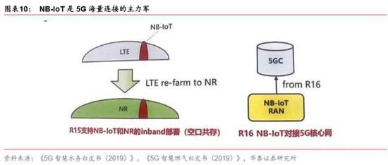NB-IoT 是物联网海量连接的主力军。5G 业务三大场景之一就是大连接(mMTC),也是 NB-IoT 技术现实的方向。当前 NB-IoT 在 R15 版本能够支持 NB-IoT 和 NR 空口共存,R16 版本将支持 NB-IoT 接入 5G 核心网络。