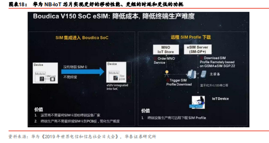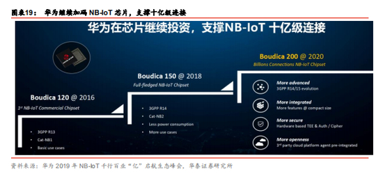 芯片主导者华为,再度加码。华为中国区 IoT 业务部部长张海在 2019 年 5 月 17 日举办 的“ 2019 年世界电信和信息社会日大会”上表示,早在 2016 年,华为就推出了基于 3GPP R13 标准的第一款 NB-IoT 商用芯片组 Boudica 120;在 2018 年,华为推出了基于 3GPP R14 标准的完整的 NB-IoT 芯片组 Boudica 150,相比此前的芯片组的功能更强、功耗更 低。在 2020 年,华为计划推出基于 3GPP R14 / 15 标准的更先进的 Boudica 200,实现 更好的移动性能、更短的时延和更低的功耗,真正实现万物互联成本大幅降低。
