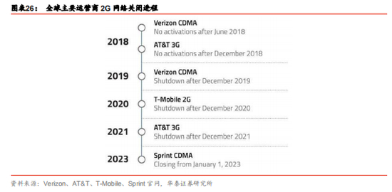 供给端强势改革为 4G 释放更多的频谱:从国外运营商来看,美国、澳大利亚、泰国等 20 多个国家的运营商早在 4G 时代就关闭了 2G 网络。比如,Verizon 在 2019 年实现 2G 全 面退网,AT&T 于 2017 年 1 月 1 日正式关闭 2G 网络、停止 2G 运营及服务,并把这些频 谱在 4G 网络上重新利用。