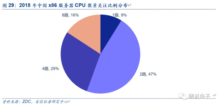 ✦按照服务器中CPU数量可以分为普通机、小型机和大型机。其中普通服务器一般分为双路、四路和八路,采用CISC架构。小型机和大型机属于非X86服务器,小型机一般为16路、32路及以上,大型机则一般以定制化独立封闭系统为主。总体来看,目前服务器市场以云计算厂商购买的双路(普通)服务器为主,根据ZDC数据显示,2018年在中国x86市场中,双路服务器受到47%的关注。