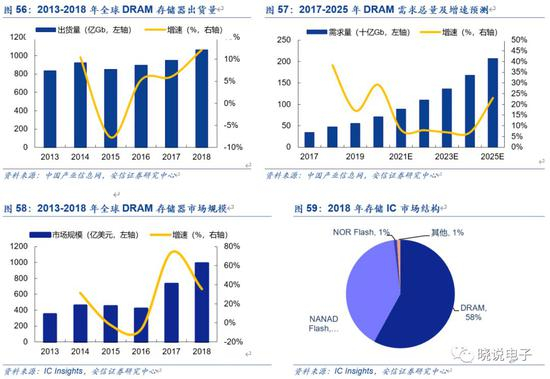 2016~2018年,DRAM出货量依次为894、948和1063亿GB,增速分别为5.3%、6.0%和12.1%。根据中国产业信息网,预计未来2~3年DRAM需求量仍将保持8%左右的年均增速,长期看仍有进一步大幅提升的空间。根据IC Insights数据,自2013年DRAM市场规模总体上升,2018年全球DRAM市场规模达989亿美元,占存储市场58%。