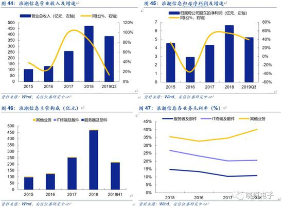 以国内服务器整机龙头厂商浪潮信息为例,公司服务器及部件占营收比重始终在95%以上。近年来公司大型互联网客户收入占比大幅提升。2017~2018年受益于云计算行业增长,公司营收增速均保持在80%以上;2019年前三季度营收382.3亿元,同比增长14%,增速有所放缓,主要是受互联网资本开支下滑的影响;但仍实现营业利润6.68亿元,同比增长38.5%,毛利率小幅提升0.29pct。