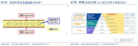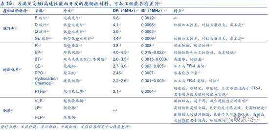 CCL由增强材料(玻纤布等)浸泡树脂加工,并以一面或双面覆盖铜箔经热压而制成。一般而言,降低Df主要通过树脂、基板及基板树脂含量来实现。普通CCL主要使用FR-4等级的环氧树脂(Epoxy),高速CCL则需要在主体环氧树脂的基础上改性或加入PP0/PPE等树脂材料。各种树脂按照Df由大到小,依次包括环氧树脂、特殊树脂/改性特殊树脂、PTFE/碳氢化物树脂/PPE树脂。普通环氧树脂Df值在0.01以上,而PTFE和碳氢化合物树脂(两种典型的高频材料)Df值在0.002以下,高速材料所用树脂的Df介于高频材料和FR-4之间。