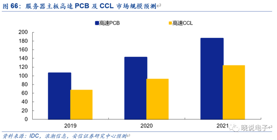 考虑到服务器主板PCB升级,以及服务器出货量回暖,经我们测算,2019~2021年服务器主板高速PCB市场规模分别为106亿元、142亿元和186亿元,高速CCL市场规模分别为67亿元、92亿元和124亿元。具体测算假设为: