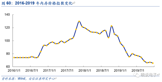 2018年下半年以来,内存价格指数持续下滑,DRAM价格进入下行周期,主要原因是移动端出货量持续放缓,影响DRAM下游需求,出货量维持稳定的同时行业供大于求。随着库存消化进入尾声,叠加全球服务器和5G智能手机出货量的乐观预期,DRAM市场开始供给紧平衡,价格也呈现回稳向上的趋势。