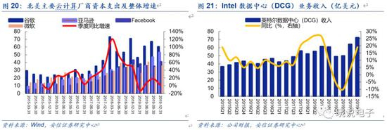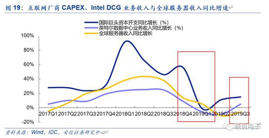 从北美云计算厂商的资本开支增速看,亚马逊、谷歌、微软、Facebook整体资本支出呈波动态势,2017Q1~2018Q1,四大云厂商CAPEX增速持续上升,2018Q1~2019Q1 CAPEX增速放缓,2019Q2起重回正增长。Intel是全球数据中心服务器芯片核心供应商,从Intel数据中心业务营收增速看,其与北美云计算巨头资本开支增速几乎趋于一致,在经历2018Q2的峰值以后回落至2019Q2的-10%的负增长,自2019Q3开始起出现回升。