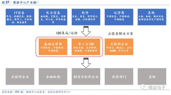 数据中心产业链由上游基础设施及硬件设备商、中游运营服务及解决方案提供商、下游终端数据流量用户构成。
