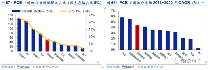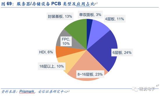 根据Prismark,2018年服务器/存储设备PCB市场规模为50亿美元,占PCB总规模的8%,预计2018~2022年CAGR为4%,仅次于汽车和无线基础设施。从产品类型来看,服务器/存储设备PCB以6层以上高多层为主,其中6层板、8~16层板和18层以上板分别占比23.70%、23.25%和9.9%,其次是芯片封装基板,占比13.1%,FPC和HDI分别占比9.7%和6.3%。即服务器/存储设备中6层以上刚性PCB合计市场规模约为28.5亿美元。结合我们的测算,未来每年有50%左右的高多层PCB存在升级需求。
