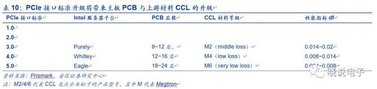 由于PCIe标准决定服务器传输速率,对服务器主板PCB层数和基材要求较高。服务器主板PCB为高速多层板(大多为8层以上板),是由多层导电图形和低介电损耗(Df)的高速CCL材料压制而成的。CCL是一种由玻纤布浸以树脂,覆以铜箔热压而成的专用于PCB制造的特殊层压板,主要承担导电、绝缘和支撑三大功能。就高速PCB而言,一方面,PCB层数越多,设计的灵活性越大,可以起到电路阻抗的作用,从而实现芯片组间高速电路信号的高速传输。另一方面,原材料CCL的Df越低,信号传输的损耗越小。伴随服务器平台的升级,数据传输速率的进一步提升,PCB层数需要不断增加,CCL材料Df值也需同步降低。