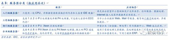 ✦按照CPU基础体系架构可以分为X86服务器和非X86服务器。其中x86服务器主要基于CISC架构,采用Intel x86指令集和windows操作系统,定位中低端市场,用于中小企业和非关键业务中。其CPU的主要供应商为Intel,根据IDC数据,Intel服务器芯片占据全球市场90%以上份额。非x86服务器基于RISC或EPIC架构,采用unix和其他专用操作系统,适合金融、电信等大型企业的核心系统,其CPU的供应商包括IBM、Intel等等。