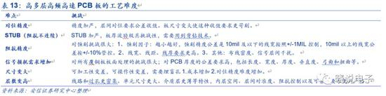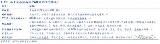 受信号传输性能和使用的基材差异的影响,PCB大致分为普通板、高速板和高频板三种。高速板的典型特征是层数要求高,一般在8层以上,需要使用Df更低的CCL材料。高速板的生产难度相比普通板更大。一方面,特定厚度的高速基材CCL,提高了PCB生产商对材料的应用要求;另一方面,PCB层数越多,对对位精度、阻抗控制等提出更高的要求,相应生产设备的配置要求也更高,工艺流程更加复杂,生产时间也更长。