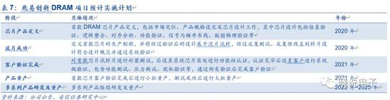 2019年9月,公司通过定增预案,拟募集资金43.2亿元,其中33.2亿元用于公司DRAM芯片自主研发及产业化项目。根据增发预案反馈意见,兆易计划于 2020 年完成首款DRAM 芯片产品定义和流片工作,确保样片设计符合规范并通过系统验证,2021 年完成客户验证和量产,2022-2025 年开展多系列产品的研发和量产工作。