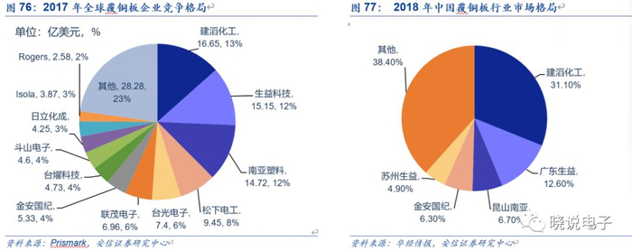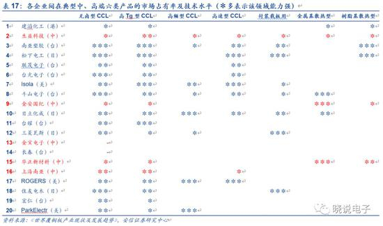 目前,高速CCL市场主要参与者包括松下(Panasonic)、依索拉(Isola)、联茂(ITEQ)、台耀(TUC)、台光(EMC)、南亚塑胶(NY)、生益科技(SY)和华正新材等。根据Prismark的数据,2018年前四家占据了近65%左右的份额。松下的市场份额最高,2017~2018年稳定在25%~30%之间,高速CCL口碑好。其次是依索拉、联茂和台耀,平均市占率在10%~15%之间。当前,国内厂商也已经实现技术突破,不断抢占更高市场份额。根据公司公告,生益科技高速产品已于2018年通过服务器客户认证并实现销售,华正新材也已经实现技术突破,2019年发布定增预案,计划投资6亿元用于建设年产650万平米的高频高速CCL青山湖制造基地二期项目。