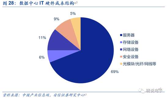 数据中心成本包括投资成本(CAPEX)和运营成本(OPEX)两块。投资成本计入固定资产后经折旧摊销,如数据中心建设成本和硬件采购成本等;运营成本是设备投入实际运行后的日常开销,如电费、维修改造费等。在硬件采购成本中,服务器占比最大,根据中国产业信息网,服务器、网络设备(交换机和路由器)、存储设备、安全设备和光模块/光纤等分别占数据中心设备采购成本的 69%、11%、6%、9%和 5%,不同方案略有不同,但总体上服务器成本占IDC硬件成本70%左右。