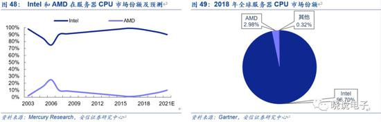 CPU是服务器的“大脑”,全球服务器CPU市场Intel一家独大,长期占据数据中心服务器芯片市场95%左右的份额。根据Gartner数据,2018年,Intel在全球服务器CPU市场份额高达96.70%,排在第二的AMD市占率为2.98%。