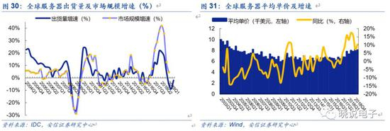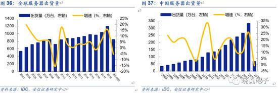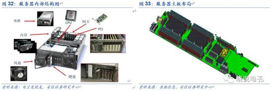根据IDC,目前服务器市场均价为8000美元/台。根据中国产业信息网,低端服务器价格1857美元/台,高端服务器则超过10000美元/台。为满足更高数据传输速率的需求,服务器平台持续升级,内部核心元件价值量同步提升,带动服务器单价走高。从服务器出货量和服务器收入的数据看,根据IDC,2017年Q3以来收入增速远高于出货量增速;从服务器市场规模和出货量倒推单价,2017年Q3以来服务器单价开始持续走高,单台服务器的价值量持续提升,2019年Q1约为8000美元。