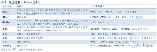 7.电源:保障电力供应,是服务器稳定长时间工作的基础。实际场景中,为保障服务器稳定工作,一般使用双电源,并且接入不同的线路。参与者有台达、艾默生、光宝科技、康舒科技、高效电子、全汉电源等。