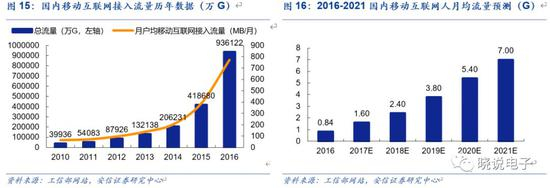 5G时代用户体验速率提高至0.1~1Gbps,峰值速率达到20Gbps,相比4G提升近10倍。数据传输速率提升,带动流量需求同步迅猛增长。据MSIT、Strategy Analytics,2019年6月韩国5G用户平均数据使用量达到24GB,是4G的2.6倍。思科预测,5G连接数有望从2019年的1300万增长到2023年的14亿,增长100倍以上。根据2018年公布的《思科云指数报告(2016-2021)》,2016年全球流量总量为6.8ZB,预计2021年将达到20.6ZB,年平均复合增长率为25%。5G加持,全球流量有望持续高增长。工信部部长苗圩表示,5G应用是二八分布,即20%用于人与人通信,80%应用于物与物通信。如果说3G/4G移动互联网依赖人口流量红利,5G时代,物联网将带来更大的流量增长空间。