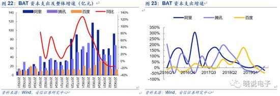 从国内互联网巨头的资本支出看,百度、腾讯、阿里的资本支出增速在2019Q3呈现出拐点,三者资本支出分别为12、66、92亿元,同比分别为-45%、+11%和-21%,合计同比-14%,整体资本支出降幅相较于二季度(-15%)小幅收窄。
