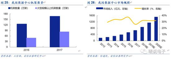 我国数据中心市场发展节奏整体滞后于全球和美国。美国数据中心市场在2001~2011年高速增长,大、中、小型数据中心均加速建设;自2012年以来,呈现出单体建设规模增加、而总数量减少的趋势。我国数据中心发展进程则相对落后,自2013年才开始进入快速发展期,根据中国信通院白皮书,2017年我国数据中心总体数量达到1844个,规划在建数量为483个,其中大型数据中心占比50%左右。2012~2017年,我国IDC市场年均复合增长率额为32%。当前我国仍处于加速发展阶段,数据中心数量和市场规模保持高增长,且以大型数据中心为主。