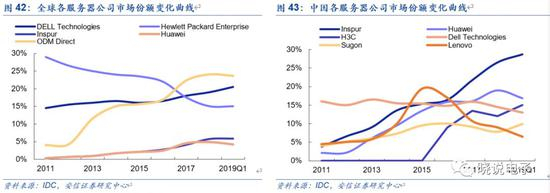 服务器属于技术和资金密集型行业,进入壁垒较高,品牌厂商和ODM厂商为主要参与者。服务器市场集中度呈上升趋势。从全球范围看,整机厂商戴尔DELL、惠普HPE、浪潮Inspur依次位列市占率前三,ODM厂商凭借成本优势抢占市场份额。国内市场中,浪潮以绝对优势占据第一,据IDC,浪潮2019Q3国内市场份额达33%,其后依次为华为、戴尔、新华三H3C、联想和中科曙光,国内ODM直销市场份额较低。