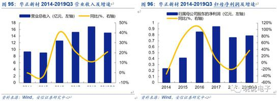 2014~2018年,公司营业收入从9.21亿元上升到16.78亿元,CAGR为16.18%。2018年,公司覆铜板业务收入达到11.06亿元,占主营业务收入的66%。公司归母净利润从2014年的0.23亿元到2018年的0.75亿元,CAGR为34.38%。2019年前三季度,公司实现营业收入14.89亿元,同比增长20.83%,归母净利润为0.78亿元,同比增长36.74%,主要原因是覆铜板业务销量增加、生产工艺优化、良率提升。
